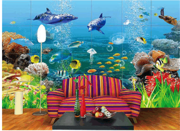 首先一種便是常見的平面幻彩背景墻,平面幻彩是指直接在平面的瓷磚加工的過程,有亮光和啞光之分。另一種是彩雕背景墻,即是在雕刻和彩印為主,其表面是凹凸不平的,特點(diǎn)是摸起來有手感,栩栩如生,也有亮光和啞光的區(qū)別。